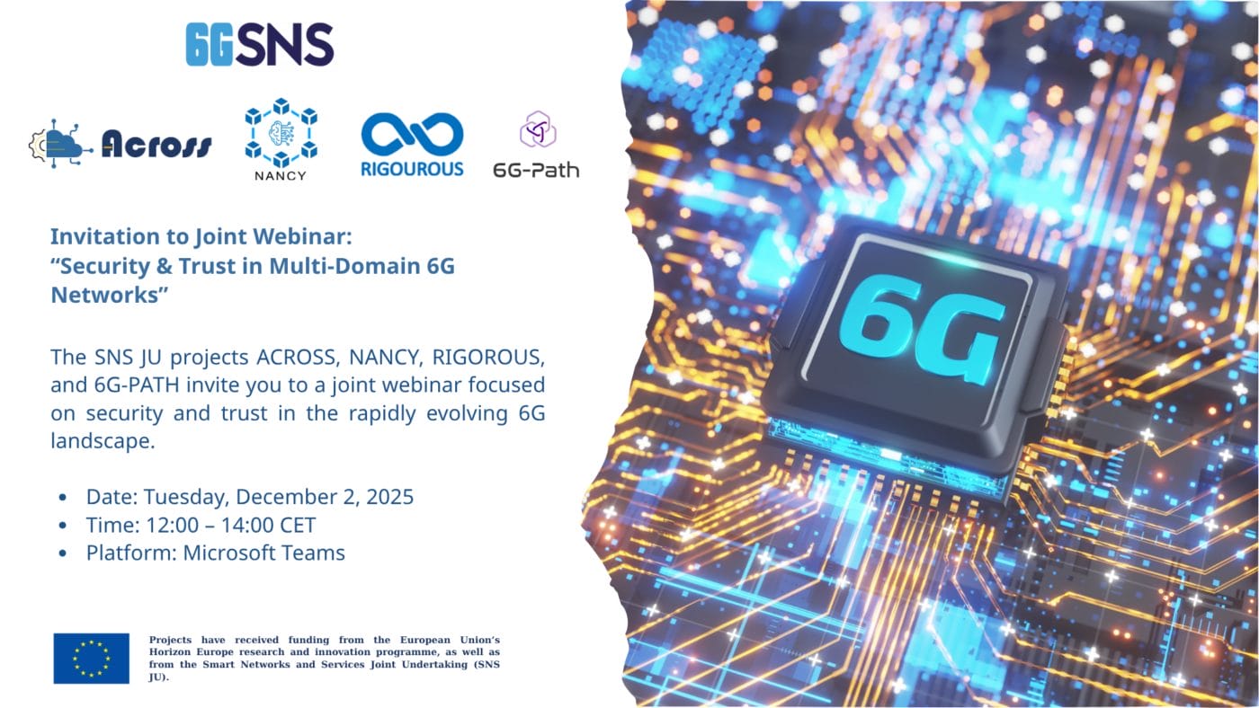 The SNS JU projects ACROSS, NANCY, RIGOROUS, and 6G-PATH invite you to a joint webinar focused on security and trust in the rapidly evolving 6G landscape.