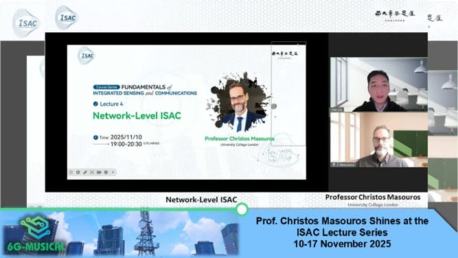 Professor Christos Masouros from University College London (project coordinator of 6G-MUSICAL) delivered two lectures in the Fundamentals of ISAC Lecture Series, co-organised by Chaspark and ISAC-ETI. His talks covered Network-Level ISAC and Security and Privacy in ISAC, addressing distributed sensing, coordination, and emerging security challenges.
