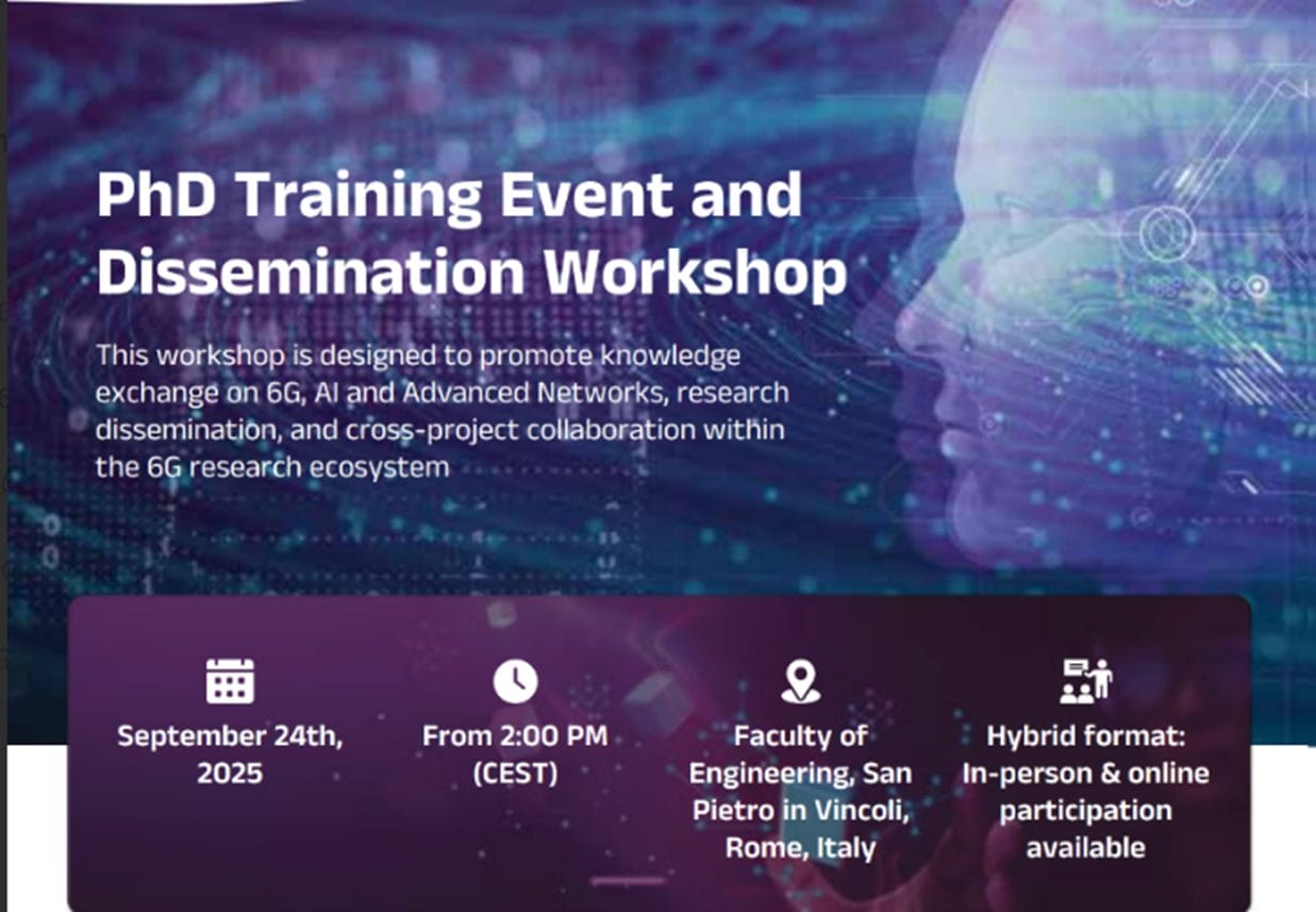On 24 September 2025, ADROIT6G held a hybrid PhD Training and Dissemination Workshop at the Faculty of Engineering, San Pietro in Vincoli, Rome. The event promoted knowledge exchange on 6G, AI, and advanced networks, encouraged cross-project collaboration, and offered certificates of attendance for potential ECTS recognition. Organized with CNIT and guided by Sergio Barbarossa, Carla Fabiana Chiasserini, and Antonella Molinaro, the workshop welcomed researchers and PhD students from across the 6G ecosystem.