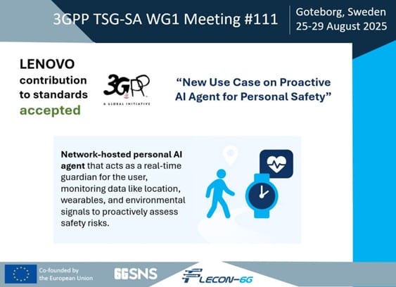 At the 3GPP TSG-SA WG1 Meeting #111 (25–29 August 2025, Gothenburg), FLECON-6G secured approval for Lenovo’s new use case on AI agents for personal safety in the 6G study TR 22.870.