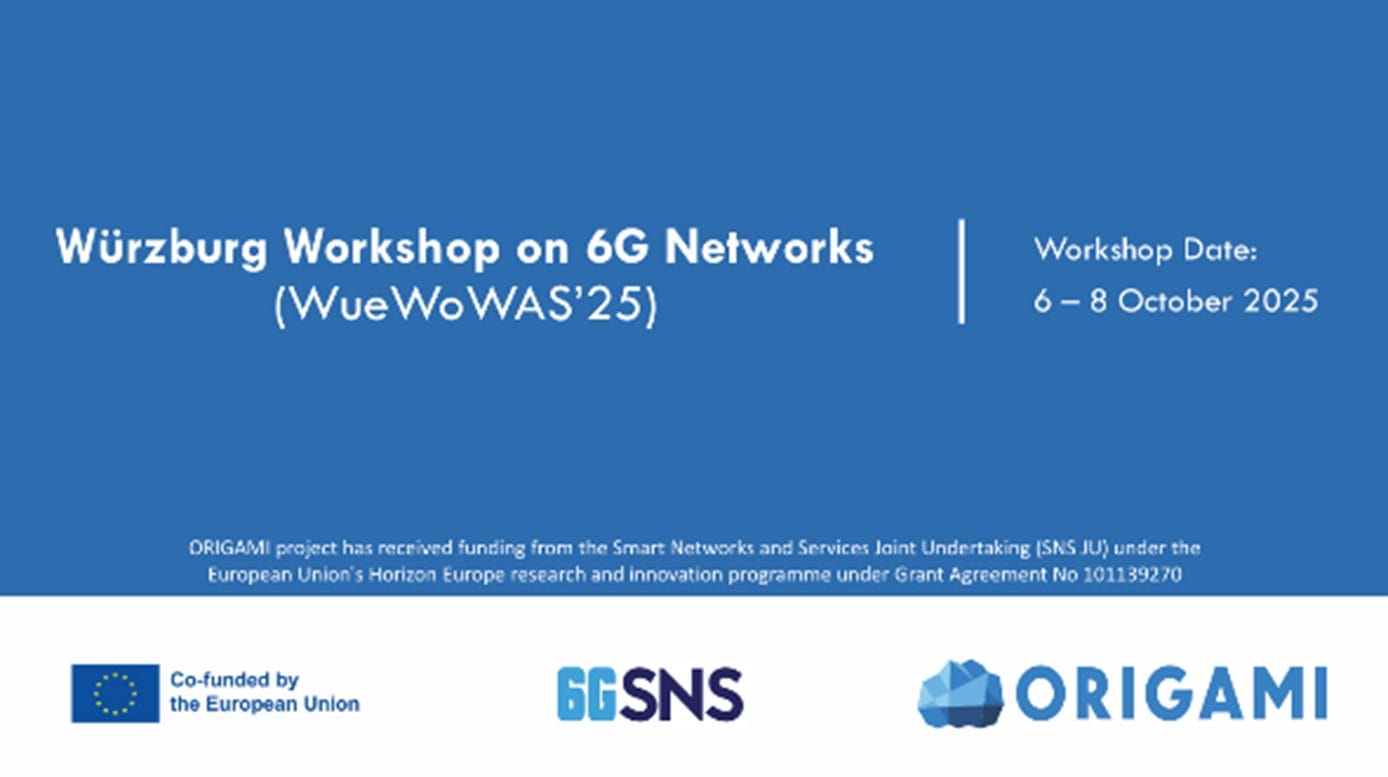 The Würzburg Workshop on 6G Networks (WueWoWAS’25) will take place 6–8 October 2025, bringing together researchers and industry experts to discuss 6G architectures, technologies, and concepts. Co-sponsored by the ORIGAMI project, the workshop will cover AI/ML integration, edge computing, network softwarization, and performance evaluation. Contributions from students and researchers aim to foster academia-industry collaboration, with accepted abstracts published open access by Würzburg University Press.